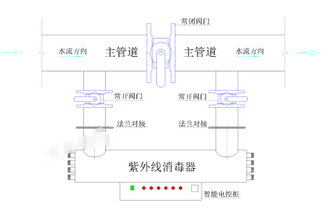 7、紫外線消毒器安裝時(shí)應(yīng)設(shè)旁通管路和截止閥便于維修。