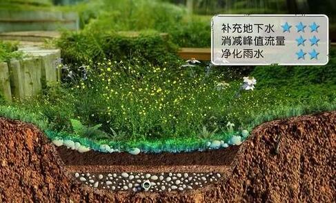 下凹式綠地集水通過(guò)草溝等形式收集場(chǎng)地中的徑流雨水,當(dāng)雨水流過(guò)地表淺溝,污染物在過(guò)濾、滲透吸收及生物降解的聯(lián)合作用下被去除,植被同時(shí)也降低了雨水流速,使顆粒物得到沉淀,達(dá)到控制雨水徑流的目的。
